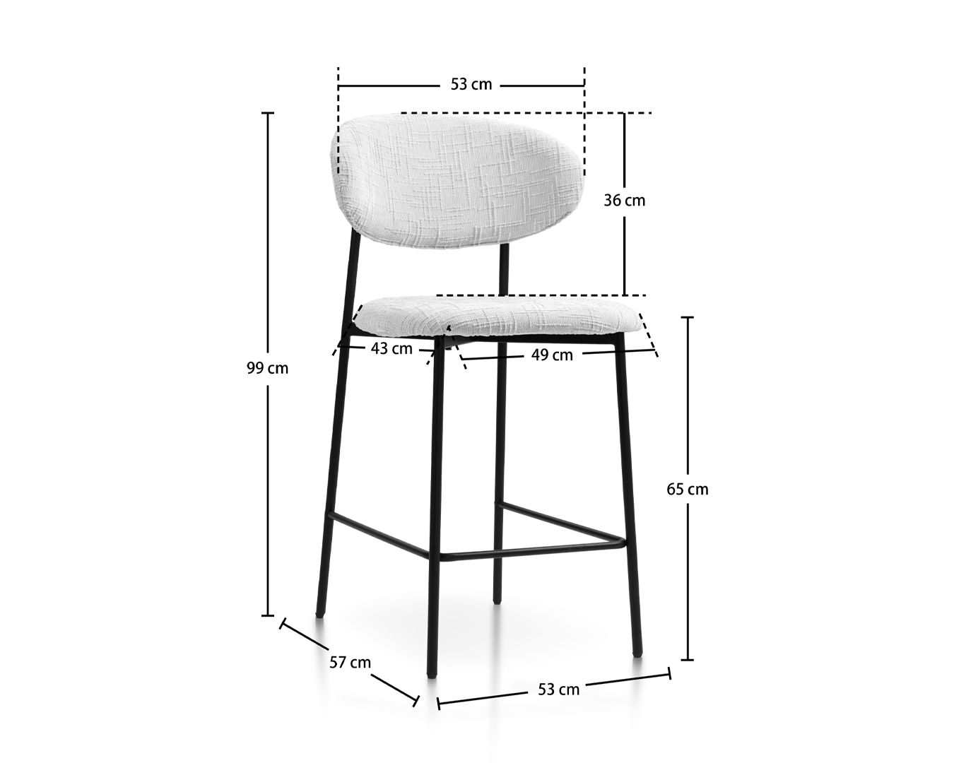 • Med et plysj, strukturert hvitt møbeltrekk på både setet og ryggstøtten, og tilbyr et sofistikert preg til alle moderne omgivelser. Den solide svartmetallrammen gir ikke bare robust støtte, men tilfører også en elegant, minimalistisk estetikk.