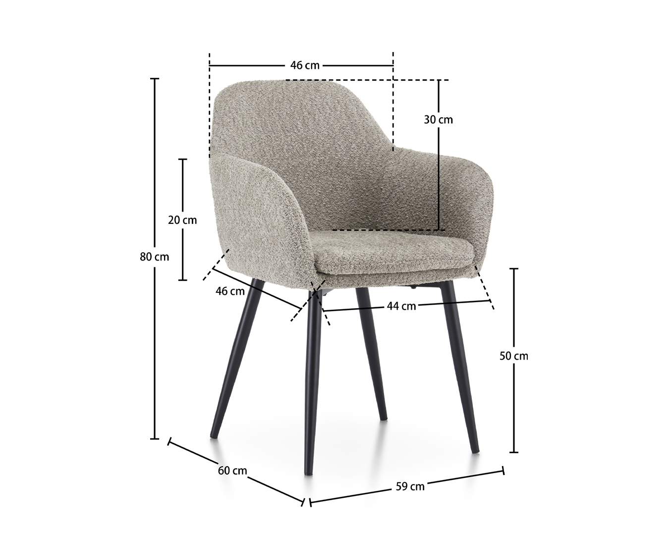 • Den ergonomiske designen sikrer optimal støtte, noe som gjør den perfekt for lange middager eller uformelle måltider, mens elegante black metal -ben gir et snev av raffinement og stabilitet, og blander sømløst med enhver dekor.