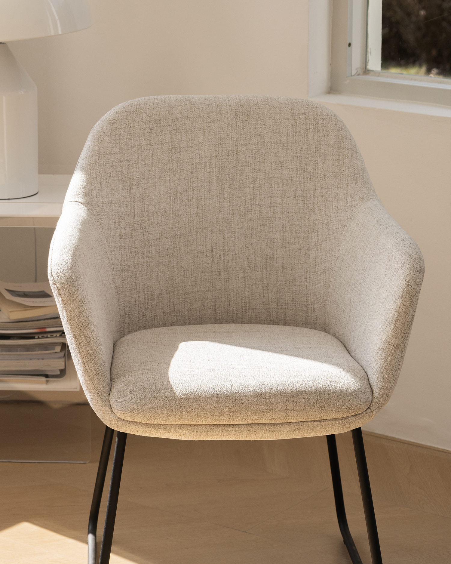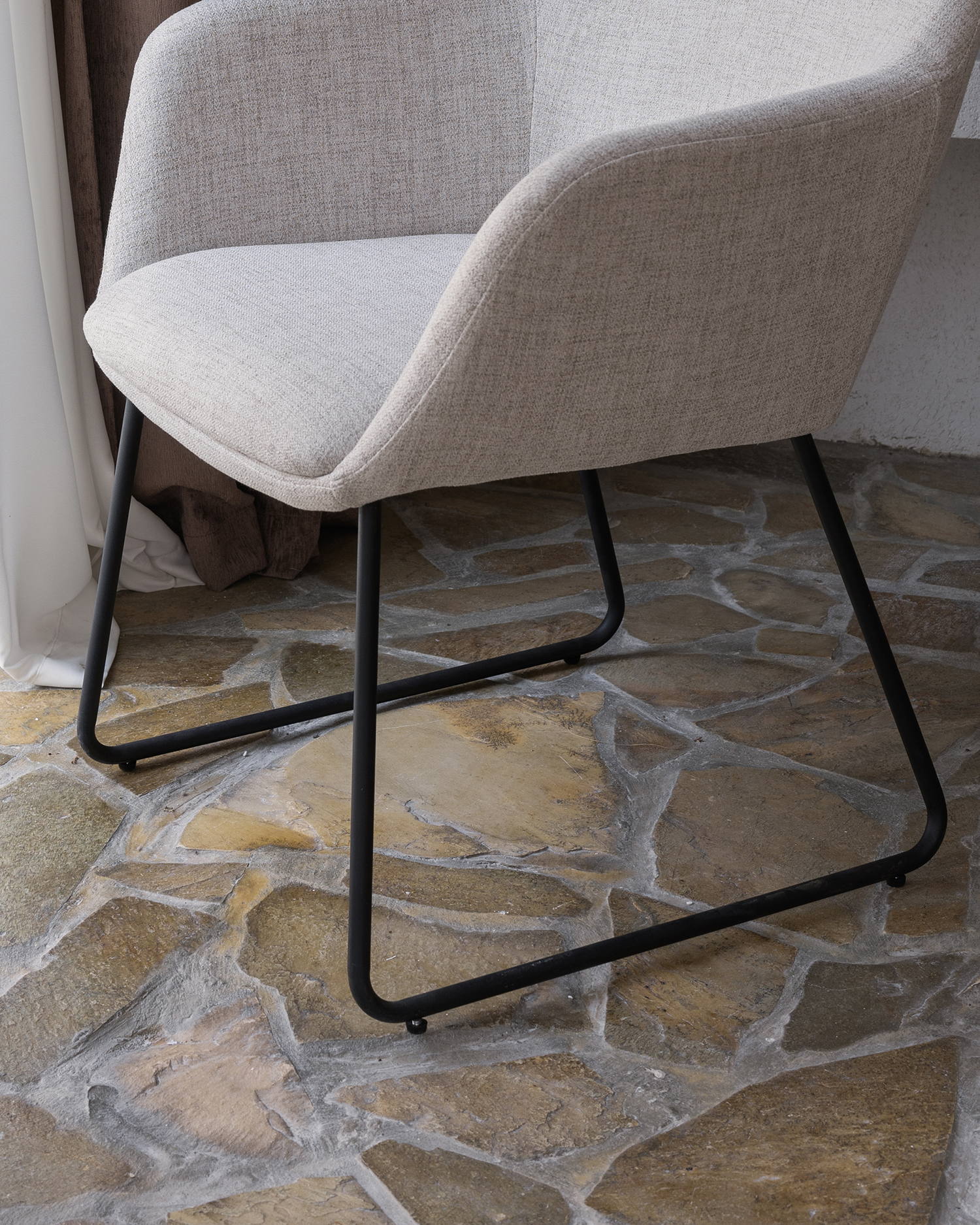 • Det elegante beige møbeltrekk sikrer maksimal komfort, mens den buede ryggstøtten støtter ryggraden din uten problemer. Stolens svartmetallben er både stilige og holdbare, noe som sikrer stabilitet og levetid.