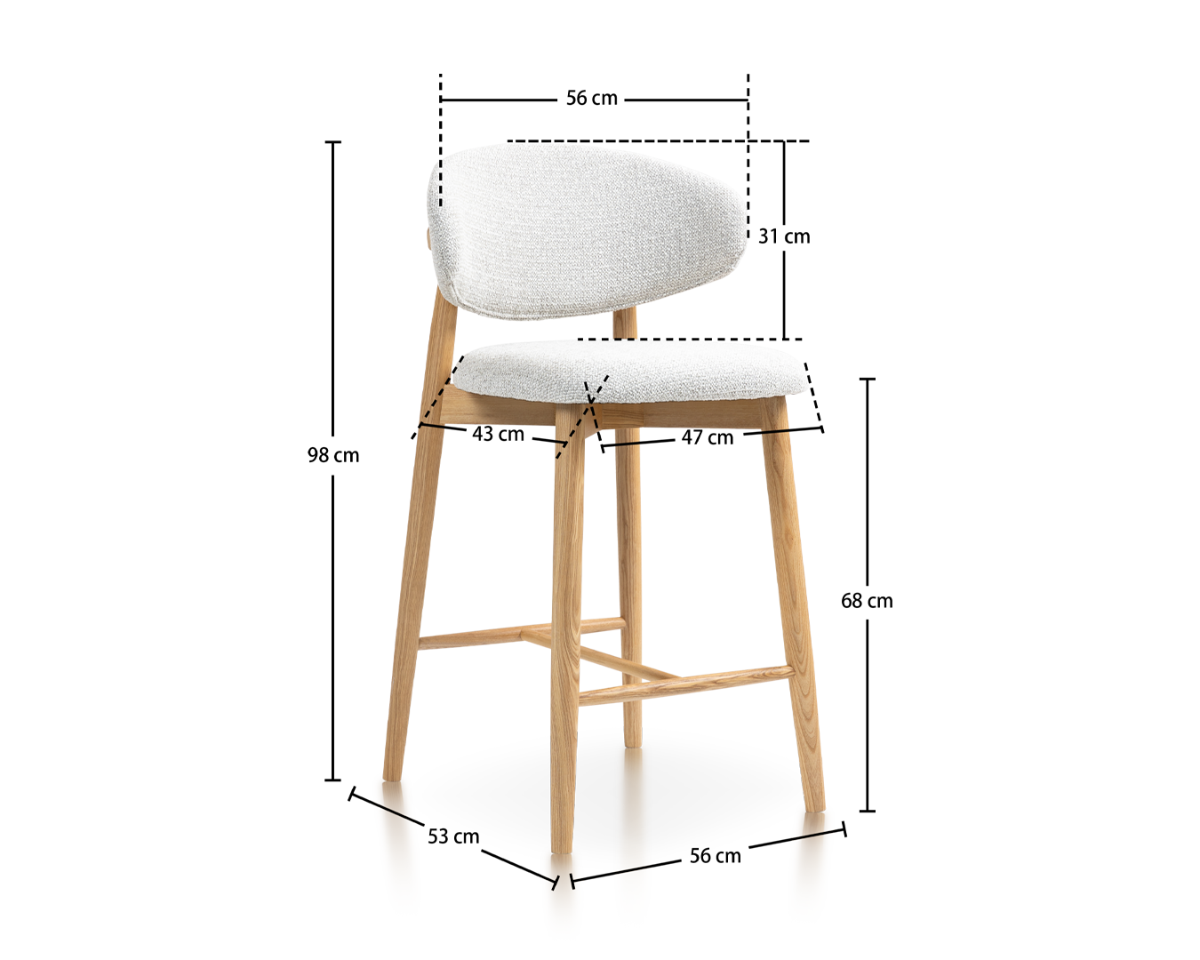 • Laget av slitesterkt askeledd og designet for å koble seg perfekt sammen med bar tellere eller kjøkkenøyer. Den solide rammen og det ergonomiske setet sikrer langvarig støtte, mens den elegante designen gjør dem til en god passform for moderne eller rustikk interiør.